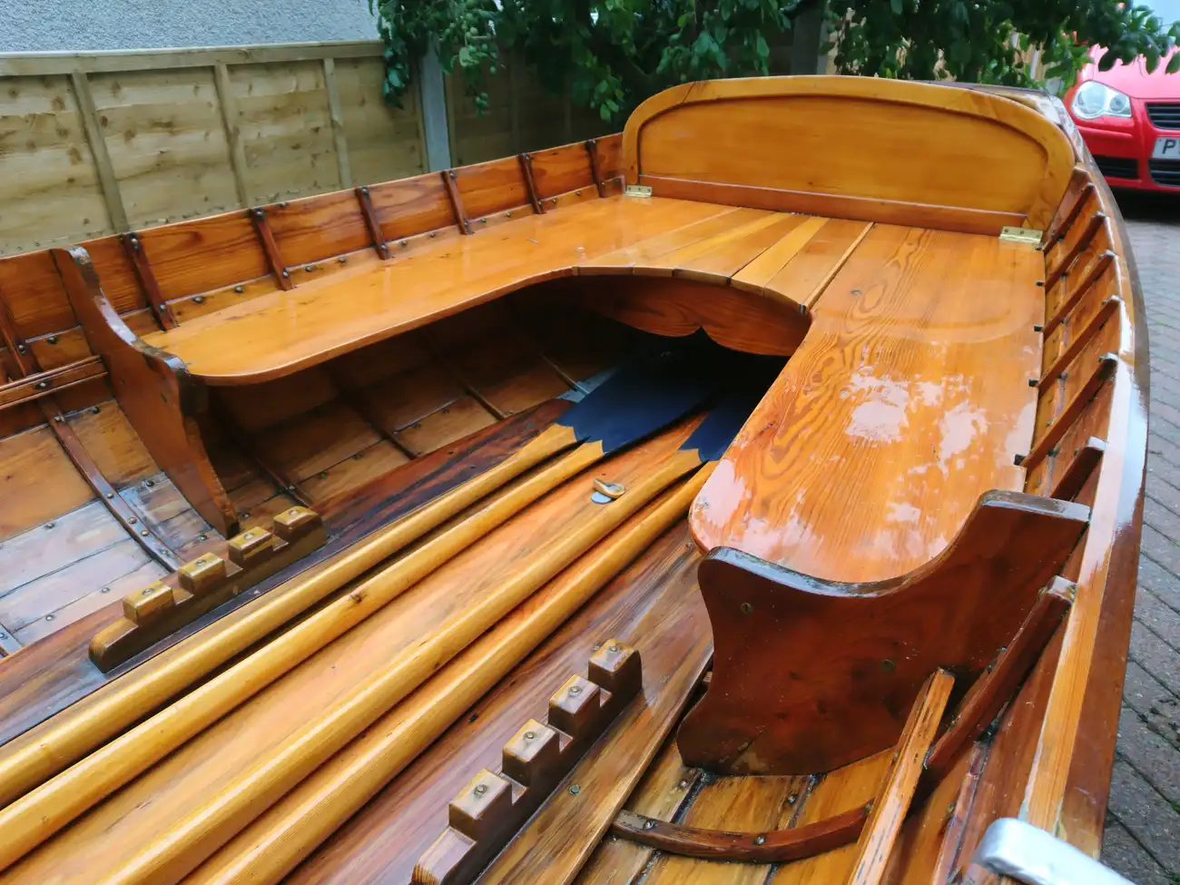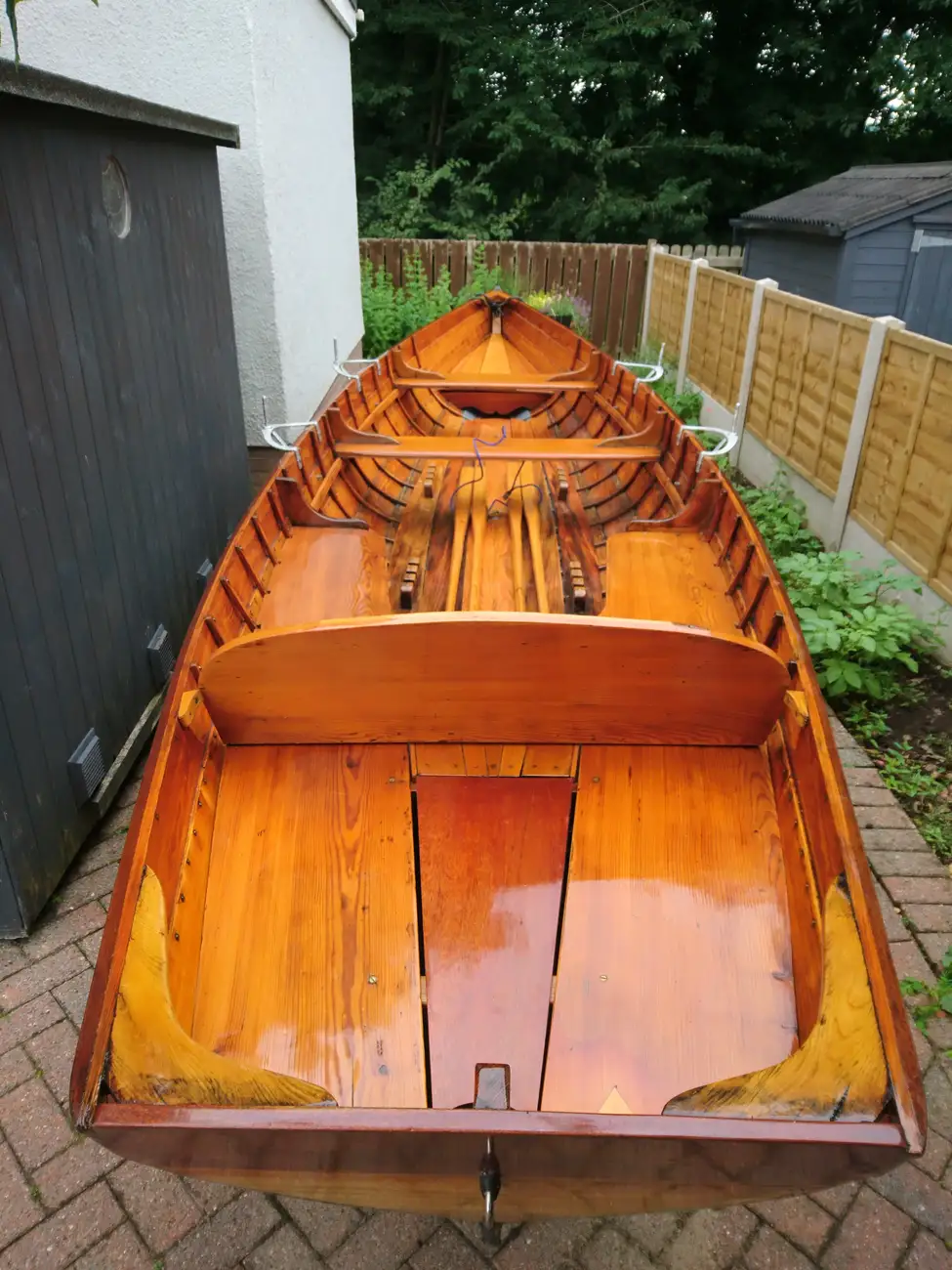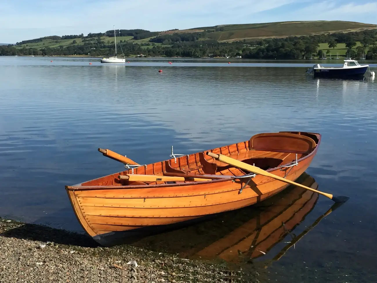 This clinker construction rowing skiff was custom built by local boat builder Ian Cooper of Windermere. Major overhauls were undertaken by another local builder, Patterson Boatworks, in 2014 and 2019 including a full strip to bare wood and recoating in multiple layers of varnish. With four sets of oars, she makes a classic dayboat for family days out or fishing with friends. A new cover was supplied in 2019 and she comes with a custom road trailer and an option to buy a small Yamaha outboard. To replace this boat new would cost a significant amount but the seller is open to discussing all offers.