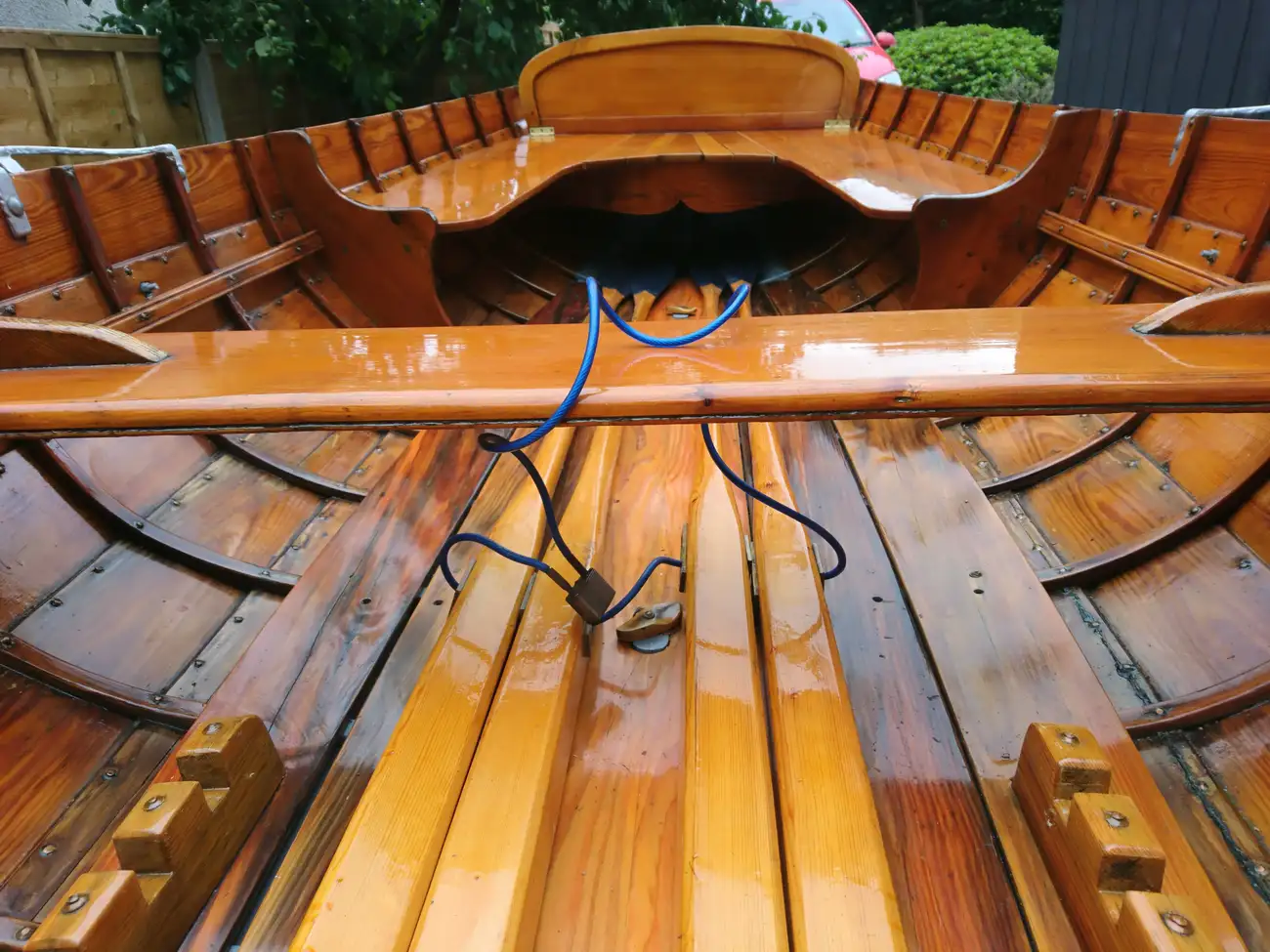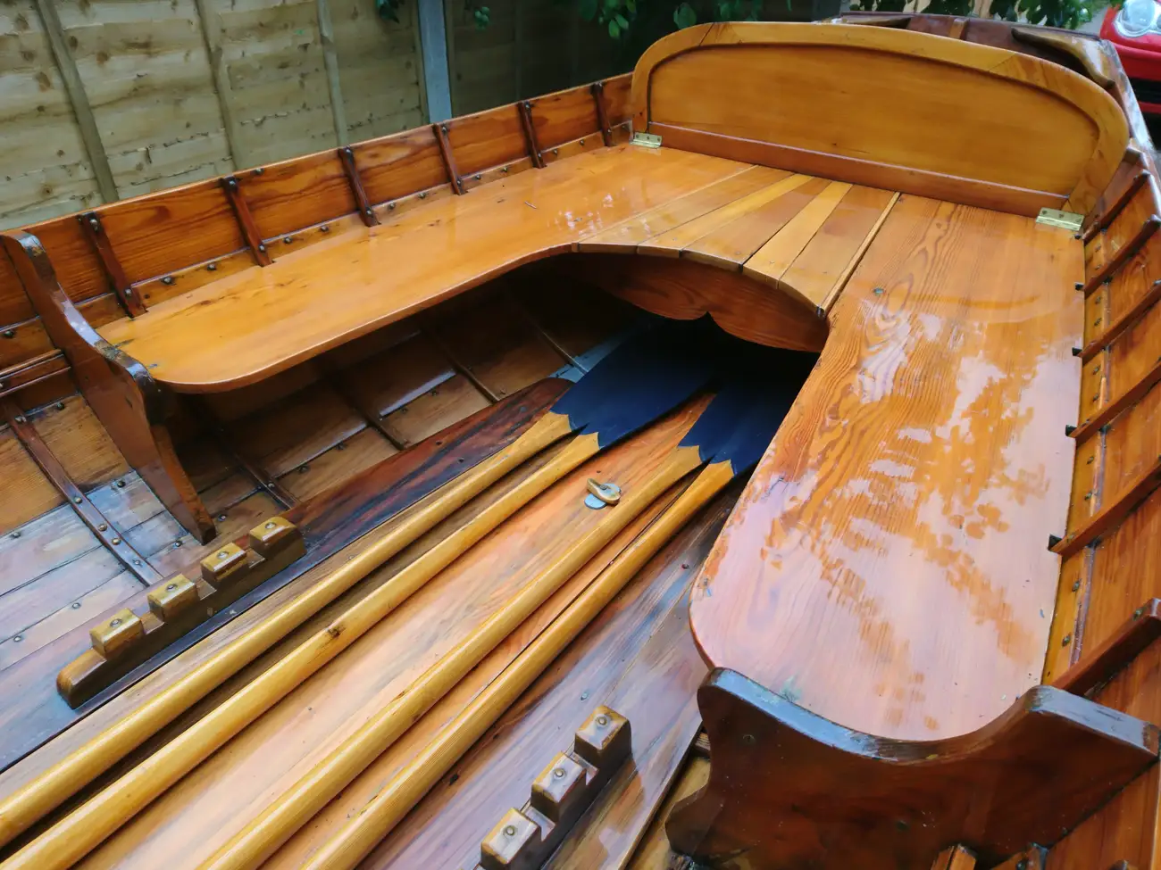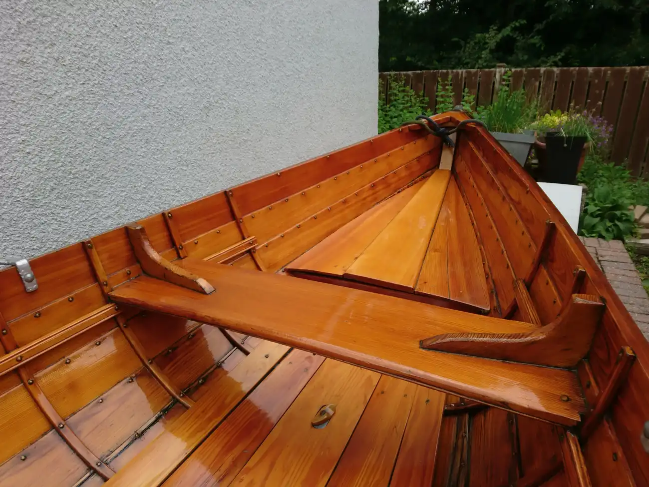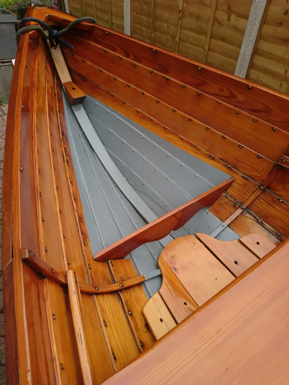 Clinker built in local Larch wood by Windermere based builder, Ian Cooper. The rowlocks are recovered from a much older Skiff called "June" which the owner inherited from his father. Major maintenance work was carried out in 2014 and 2019 by Patterson Boatworks of Hawkshead when the boat was stripped to bare wood and recoated with multiple coats of varnish.