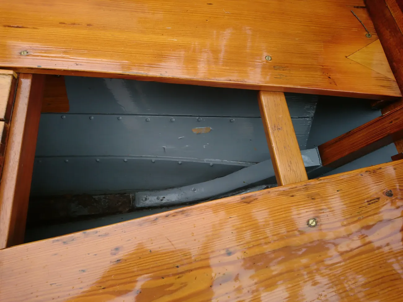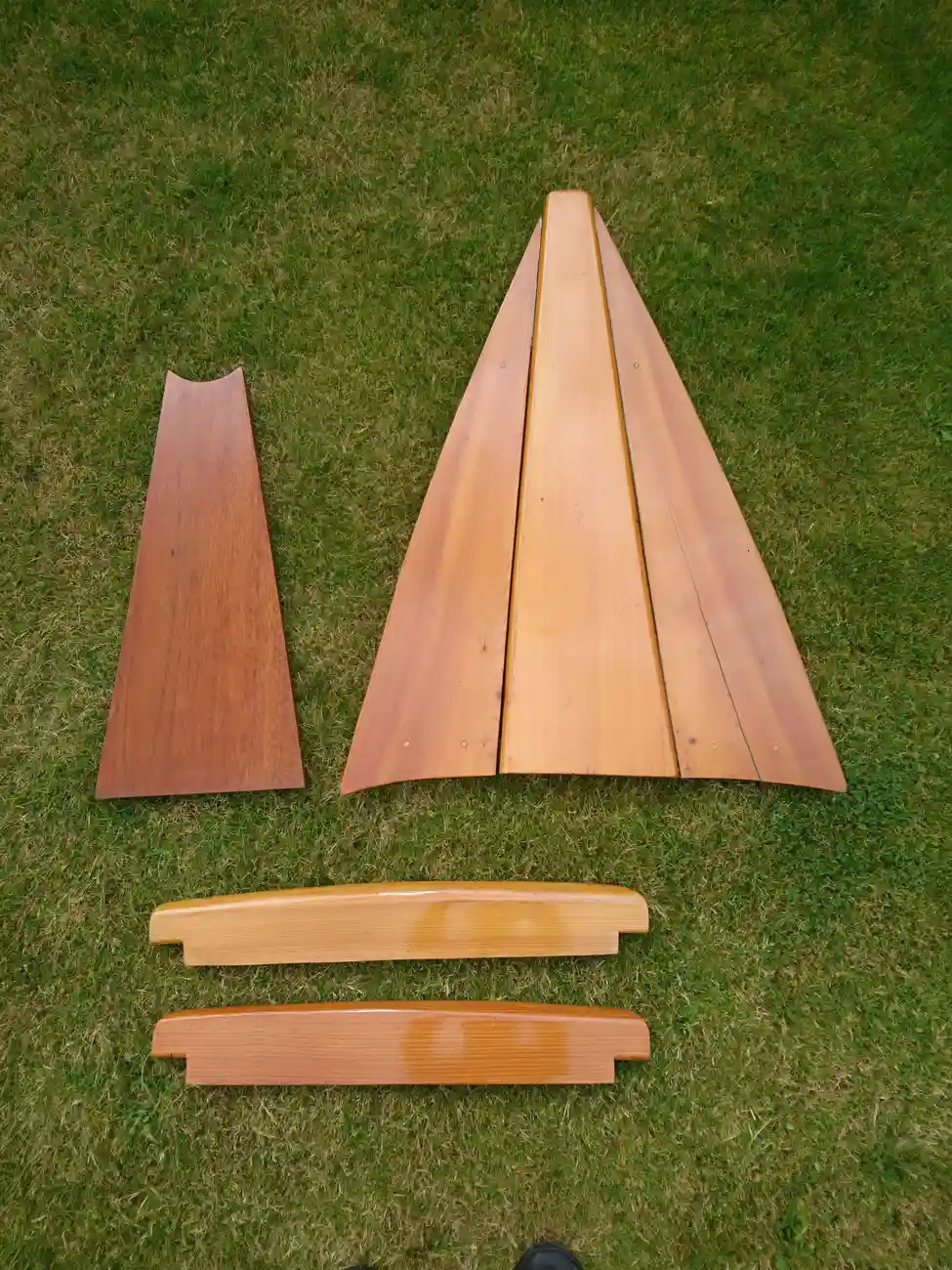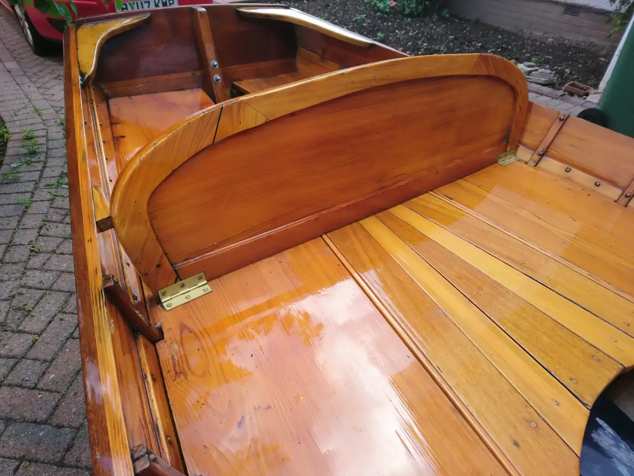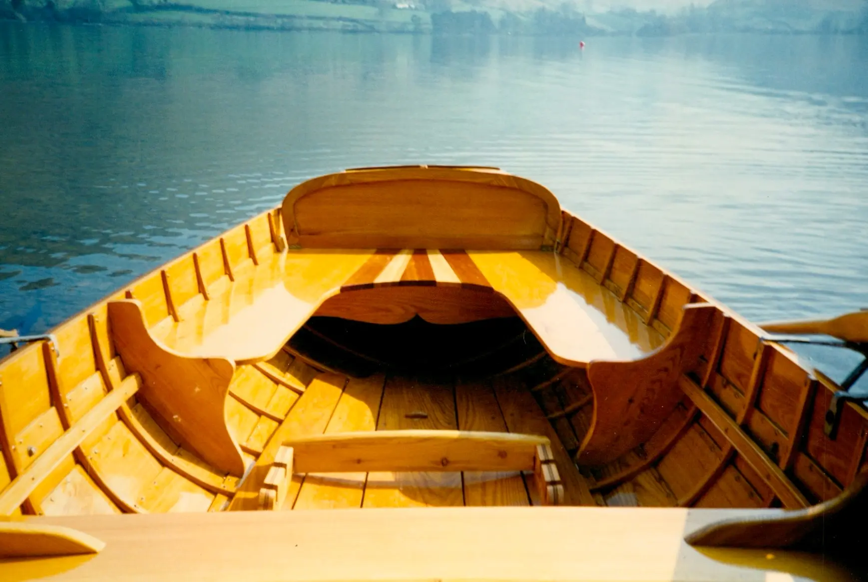 Clinker built in local Larch wood by Windermere based builder, Ian Cooper. The rowlocks are recovered from a much older Skiff called "June" which the owner inherited from his father. Major maintenance work was carried out in 2014 and 2019 by Patterson Boatworks of Hawkshead when the boat was stripped to bare wood and recoated with multiple coats of varnish.